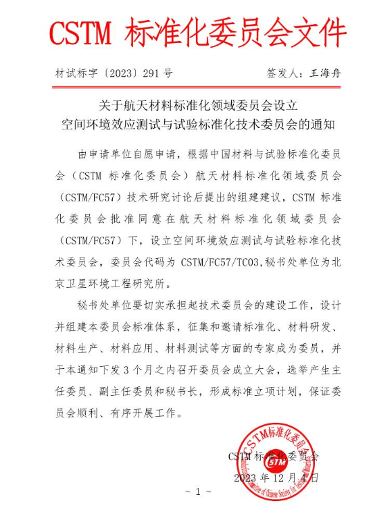 中关村材料试验技术联盟关于航天材料标准化领域委员会设立空间环境效应测试与试验标准化技术委员会的通知