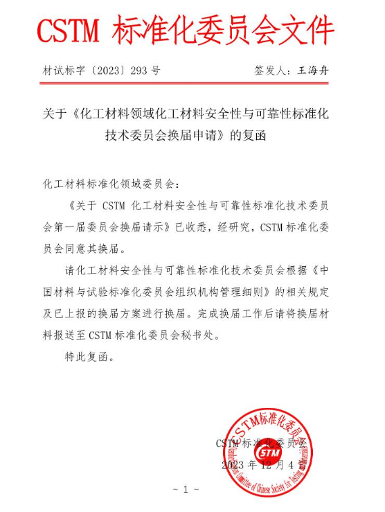 中关村材料试验技术联盟关于《化工材料领域化工材料安全性与可靠性标准化技术委员会换届申请》的复函